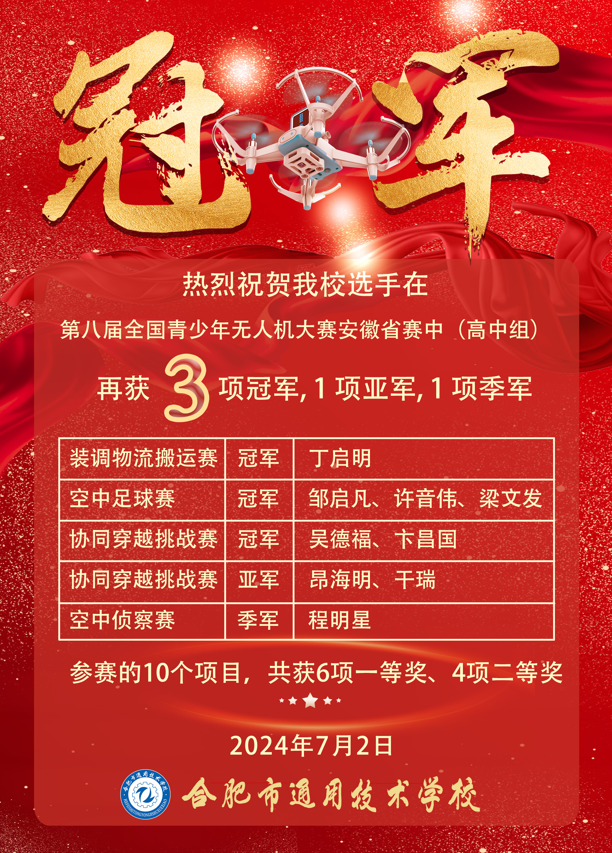 6月29-30日,第八届全国青少年无人机大赛安徽省赛暨第四届安徽省青少年无人机大赛在合肥市第一中学滨湖校区开赛。来自全省各市的2416支队伍参赛,经过激烈角逐,合肥市通用技术学校科技创新社团的12名同学,共获6项一等奖,4项二等奖,其中冠军3项、亚军和季军各1项。
